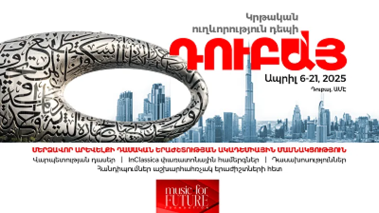 Մերձավոր Արևելքի դասական երաժշտության ակադեմիան «Երաժշտություն հանուն ապագայի» հիմնադրամի հետ միասին առաջարկում են ճանապարհորդության բացառիկ հնարավորություն: Հիմնադրամն արդեն երրորդ անգամ նախաձեռնում է «Կրթական ուղևորություն» դեպի Դուբայ: Ակադեմիան անցկացվելու է 2025 թ․-ի ապրիլի 6-ից 21-ը։