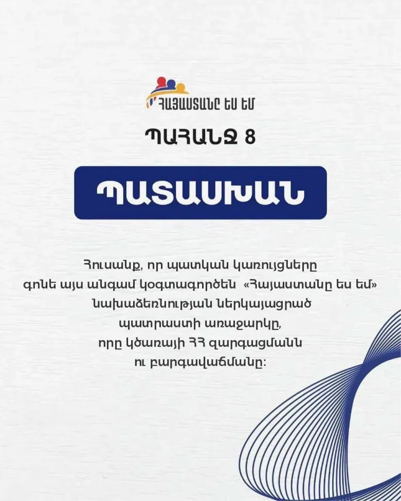«Հայաստանը ես եմ» նախաձեռնության ֆեյսբուքյան էջում հրապարակվել է նախաձեռնության՝ պետական կառույցներին ներկայացված 8-րդ առաջարկ-պահանջի պատասխանը.