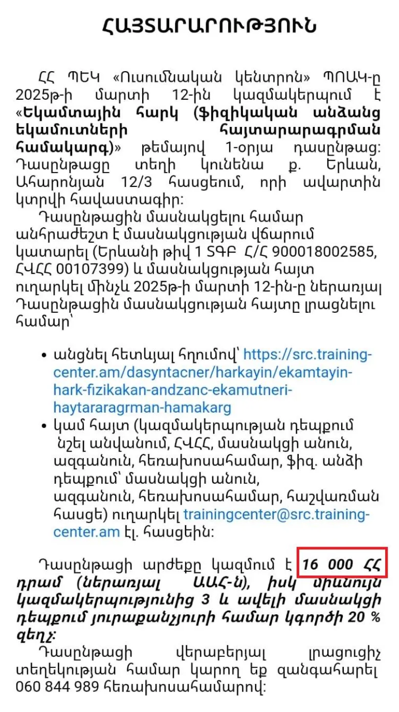 ՊԵԿ-ը հայտարարել է, որ 16,000 դրամով մեկօրյա դասընթացներ է կազմակերպում՝ քաղաքացիներին սովորեցնելու, թե ինչպես լրացնեն հայտարարագիրը, երբ «Հայաստանը ես եմ» նախաձեռնությունն արդեն մեկ ամսից ավելի է, ինչ անվճար խորհրդատվություն է տրամադրում ՀՀ քաղաքացիներին՝ հայտարարագրի, իրենց իրավունքները պաշտպանելու և անհարկի չհարկվելու թեմայով։