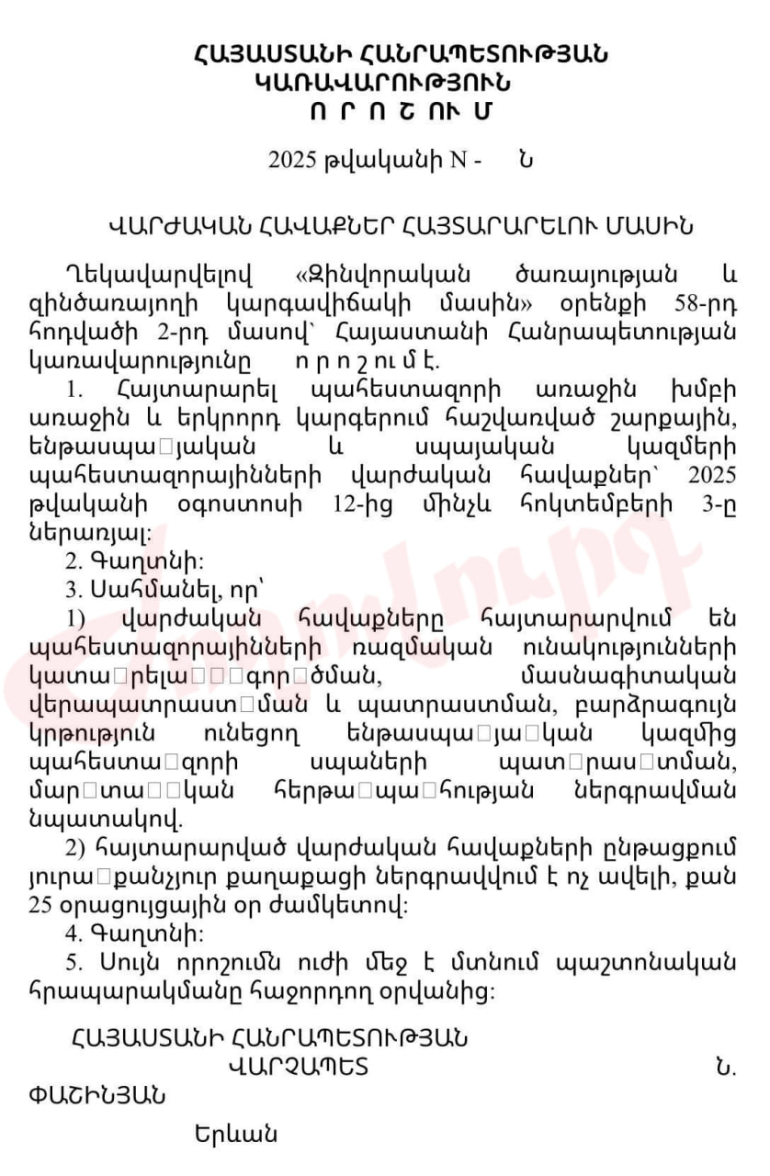 Փաստաթուղթ․ վարժական հավաքների նոր ժամկետ կներկայացվի ԱԺ. «Ժողովուրդ»