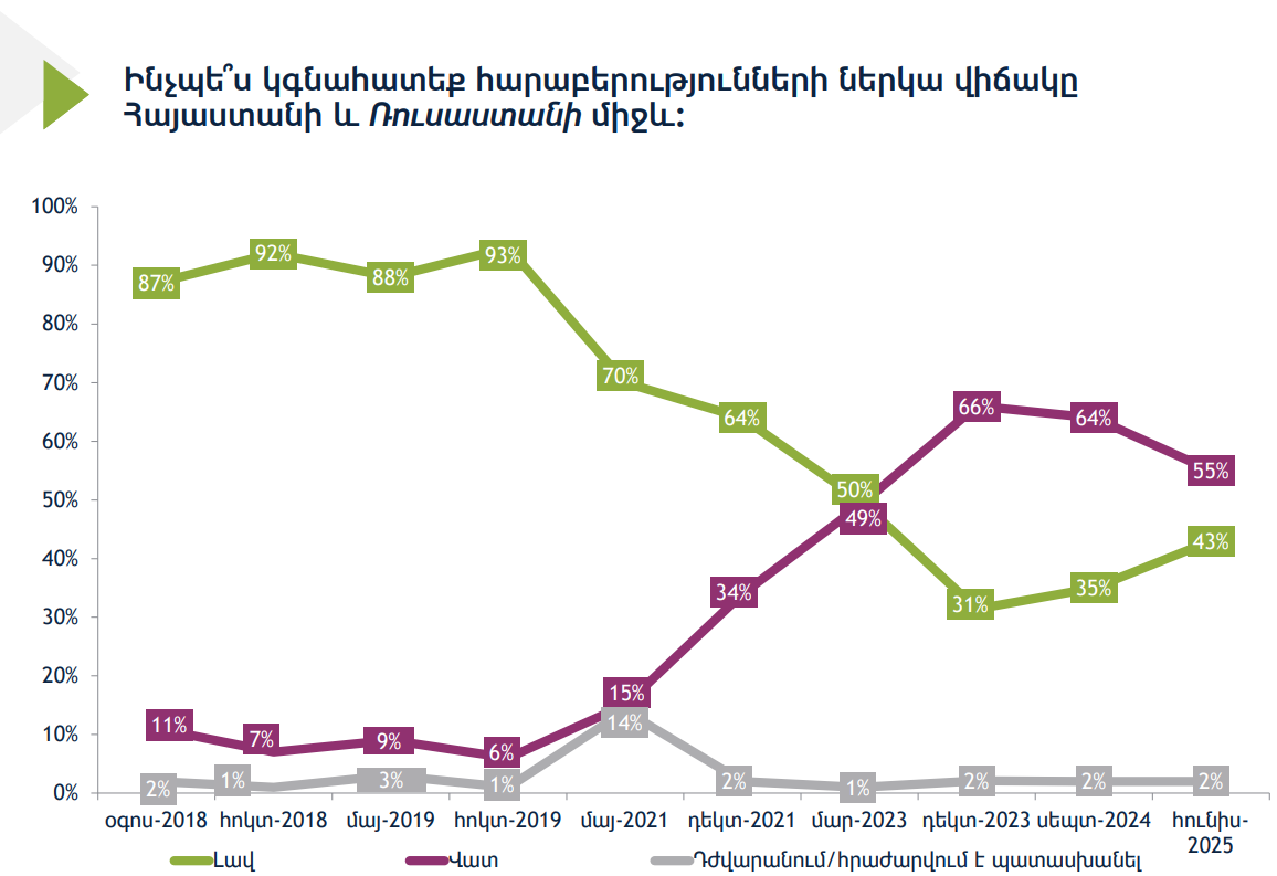 Ամերիկյան միջազգային հանրապետական ինստիտուտի վերջին հարցումները չափազանց ուշագրավ մի տենդենց են արձանագրում։ Մասնավորապես, հարցերից մեկը վերաբերում էր Հայաստանի և Ռուսաստանի միջև հարաբերությունների ներկայիս վիճակին։ 2025 թվականի հունիսին հարցվածների 55 տոկոսը վատ է գնահատել հարաբերությունների ներկայիս վիճակը, դրական՝ միայն 43 տոկոսը։ Առաջին հայացքից այս զարգացումը կարող է տարօրինակ թվալ, բայց հաշվի առնելով նախորդ հարցումների հետ, չէ՛, բավականին ուշագրավ պատկեր ենք ստանում։