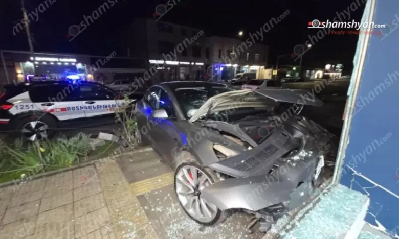 Արտակարգ դեպք՝ Երևանում, «Tesla»-ն բախվել է եզրաքարին, կոտրել «Team Telecom»-ի մասնաճյուղի ապակին, վիրավnր կա․ Shamshyan