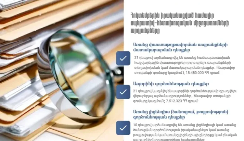 Պետական եկամուտների կոմիտեն հորդորում է հարկ վճարողներին գործել օրենքի դաշտում, հետևել օրենքի պահանջներին՝ ստեղծելով կայուն և վստահելի բիզնես: Իրավախախտումների կանխման, խափանման և բացահայտման ուղղությամբ իրականացվող օպերատիվ-հետախուզական միջոցառումների նպատակն է նվազեցնել ստվերային տնտեսությունը և ստեղծել առողջ տնտեսական միջավայր բիզնեսի համար։