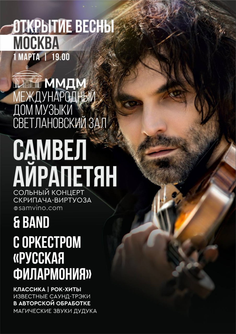 1 марта в 19:00 в Московском международном Доме музыки пройдет концерт скрипача-виртуоза Самвела Айрапетяна и его бэнда при участии оркестра «Русская филармония». Гостей ждет экспрессивное шоу, объединяющее классику и современное звучание.