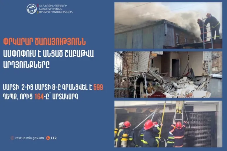 Մարտի 2-8-ը ՆԳՆ 112 օպերատիվ կառավարման կենտրոնում գրանցվել է 599 դեպք, որից 164-ը՝ արտակարգ: Փրկարար ծառայությունն ամփոփել է անցած շաբաթը:
