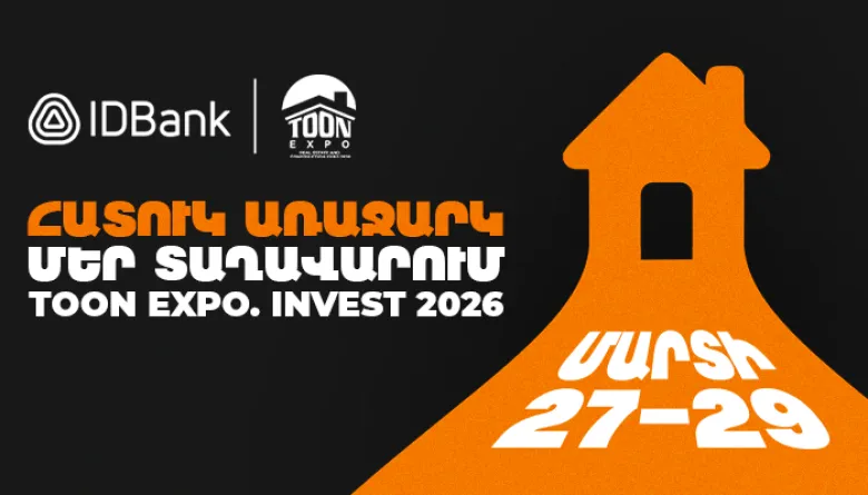 IDBank-ը մասնակցում է TOON EXPO 2026-ին և մարտի 27-29-ը ներկայանալու է հիփոթեքային վարկերի շահավետ առաջարկներով, անակնկալ նվերներով և պատրաստ օգնելու գնել ձեր երազանքների բնակարանը։
