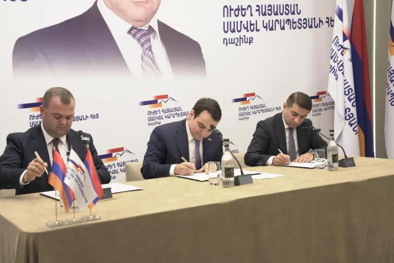 Մարտի 31-ին «Ուժեղ Հայաստան» կուսակցության խորհրդի անդամ Նարեկ Կարապետյանը դաշինքի ստեղծման վերաբերյալ հուշագիր է ստորագրել «Նոր դարաշրջան» կուսակցության նախագահ Հարություն Հարությունյանի և «Միավորված հայեր» կուսակցության պատվավոր նախագահ, լիազոր ներկայացուցիչ Նաիրի Սարգսյանի հետ։ Ստորագրված փաստաթղթով կողմերը հայտարարում են, որ միավորվում են «Ուժեղ Հայաստան» կուսակցության քաղաքական օրակարգի և նախընտրական ծրագրի շուրջ՝ հիմքում դնելով պետականության ամրապնդման, ազգային և հոգևոր արժեքների պաշտպանության, արդյունավետ և հաշվետու կառավարման, տնտեսական կայուն զարգացման, ինչպես նաև իրավական և սոցիալական արդարության ապահովման սկզբունքները։