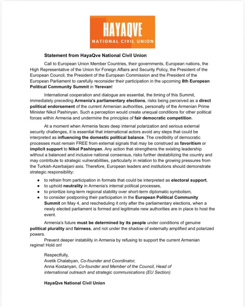 «ՀայաՔվե» ազգային քաղաքացիական միավորումը պաշտոնական նամակ-կոչով դիմել է Եվրոպական Միության անդամ պետություններին, նրանց կառավարություններին, Միության արտաքին գործերի և անվտանգության քաղաքականության հարցերով գերագույն ներկայացուցչին, Եվրոպական խորհրդի նախագահին, Եվրոպական հանձնաժողովի նախագահին և Եվրոպական խորհրդարանի նախագահին՝ վերանայելու իրենց մասնակցությունը Երևանում կայանալիք Եվրոպական քաղաքական համայնքի 8-րդ գագաթնաժողովին։