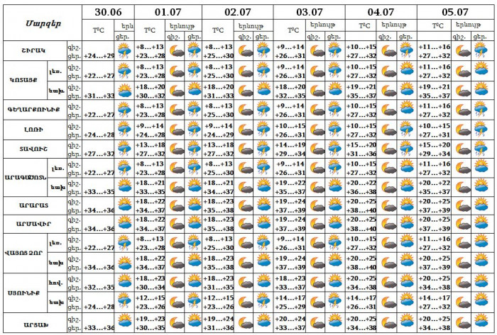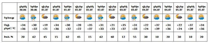 Օդի ջերմաստիճանը հունիսի 30-ի ցերեկը կնվազի 1-2 աստիճանով, հուլիսի 1-4-ի ցերեկն աստիճանաբար կբարձրանա 3-4 աստիճանով։