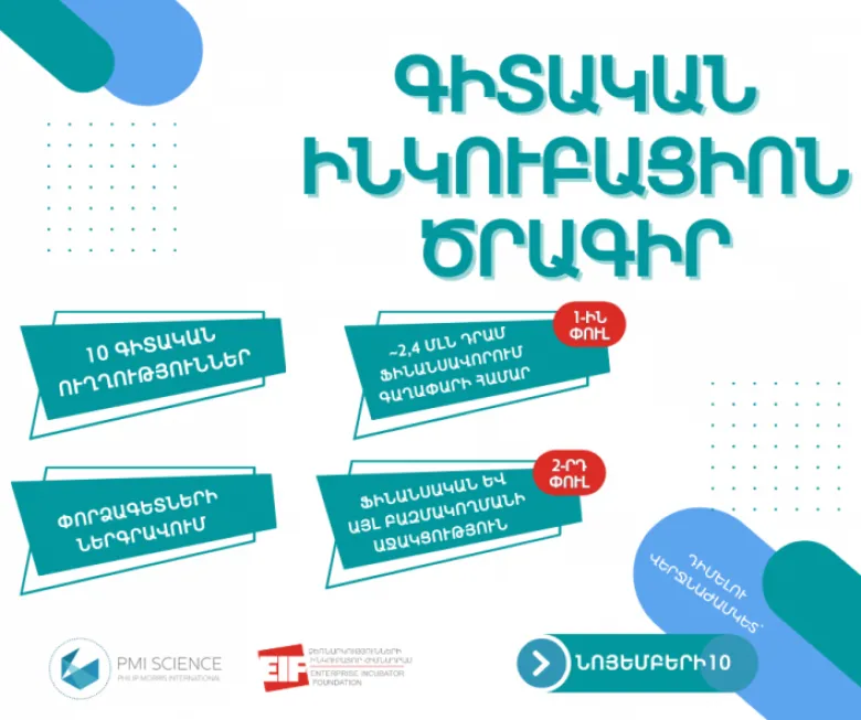 Ծրագիրն իրականցվում է «Ձեռնարկությունների ինկուբատոր» հիմնադրամի կողմից՝ PMI Science-ի աջակցությամբ:
