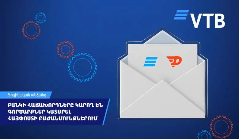 ՎՏԲ-Հայաստան Բանկը հնարավորություն է ընձեռել ֆիզիկական անձ հաճախորդներին համալրել հաշիվները, ավանդները և վճարել վարկերը Հայփոստ փոստային կապի ազգային օպերատորի բաժանմունքներում: Բոլոր գործարքներն իրականացվում են ազգային արժույթով՝ ՀՀ դրամով։ Մեկ օրվա ընթացքում գործարքների քանակը սահմանափակված չէ։