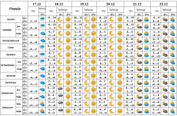 Դեկտեմբերի 18-ի գիշերն առանձին շրջաններում սպասվում են տեղումներ, լեռնային և նախալեռնային շրջաններում՝ ձյուն, 18-ի առավոտյան ճանապարհներին՝ մերկասառույց։ Դեկտեմբերի 18-ի ցերեկը, 19-22-ին սպասվում է առանց տեղումների եղանակ։ Քամին՝ հյուսիսարևմտյան 3-6 մ/վ: Օդի ջերմաստիճանը դեկտեմբերի 18-19-ի գիշերը կնվազի 7-10 աստիճանով։