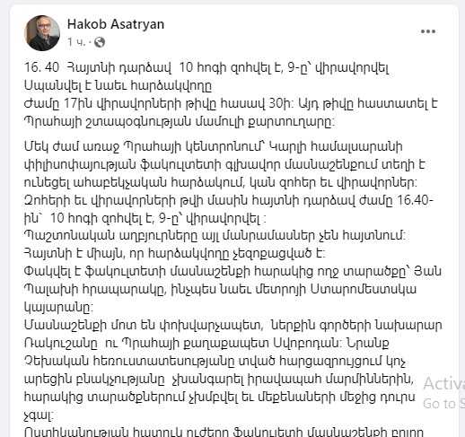 Փակվել է ֆակուլտետի մասնաշենքի հարակից ողջ տարածքը՝ Յան Պալախի հրապարակը, ինչպես նաեւ մետրոյի Ստարոմեստսկա կայարանը։