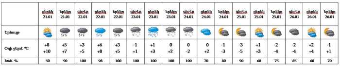 Հունվարի 24-ի ցերեկը առանձին շրջաններում, 22-23-ին, 24-ի գիշերը շրջանների մեծ մասում սպասվում են տեղումներ, լեռնային և նախալեռնաային շրջաններում՝ ձյուն և մառախուղ։ Հունվարի 22-ի ցերեկը, 23-ին առանձին հատվածներում՝ ինտենսիվ, սպասվում է նաև բուք, ճանապարհներին՝ մերկասառույց։ Հունվարի 25-26-ին սպասվում է առանց տեղումների եղանակ։ Քամին՝ հյուսիսարևելյան 3-6 մ/վ, հունվարի 22-23-ին առանձին վայրերում սպասվում է քամու ուժգնացում 14-18մ/վ արագությամբ: Օդի ջերմաստիճանը հունվարի 22-ի ցերեկը, 23-ին աստիճանաբար կնվազի 7-9, Լոռիում, Տավուշում, Սյունիքում 14-16 աստիճանով։