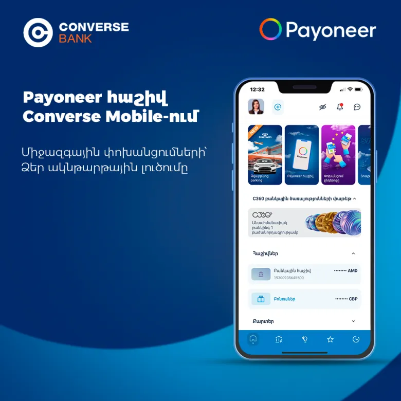Կոնվերս Բանկն առաջարկում է միանալ Payoneer համակարգին և վայելել արտերկրից եկամտի ստացման ողջ հարմարավետությունը մեկ հարթակում՝ Converse Mobile-ում: