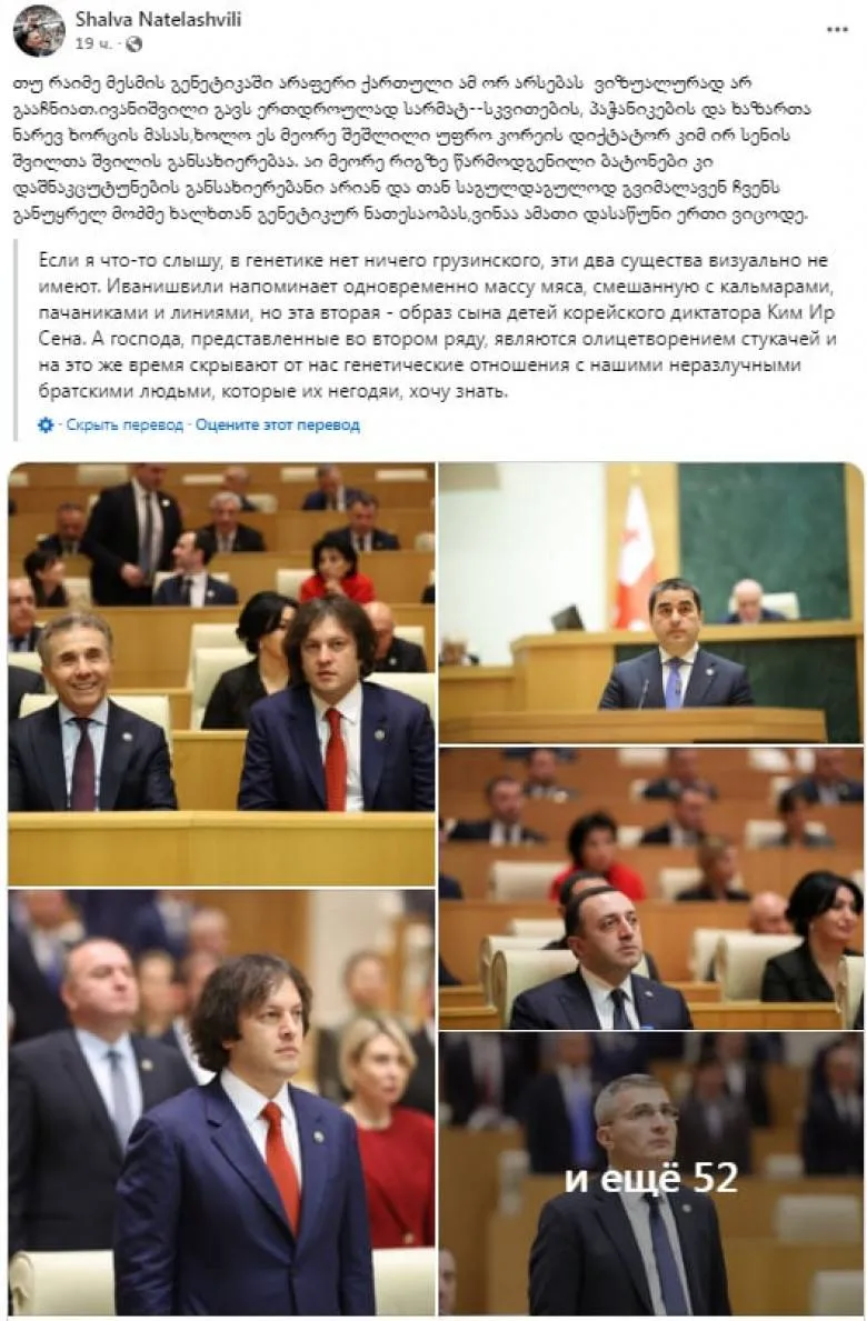 «Եթե գենետիկայից ինչ-որ բան հասկանում եմ, այս երկու էակներն (խոսքը Բիձինա Իվանիշվիլիի և Իրակլի Կոբախիձեի մասին է - «Փաստ») իրենց տեսքով որևէ վրացական բան չունեն: Իվանիշվիլին միաժամանակ նման է սարմատ-սկյութների, պեչենեգների և խազարների խառնածին մսի զանգվածի, իսկ այս երկրորդ խելագարը՝ ավելի շուտ Կորեայի դիկտատոր Կիմ Իր Սենի թոռան կերպարն է: Իսկ երկրորդ շարքում ներկայացված պարոնները դաշնակցականների մարմնավորումներն են և խնամքով թաքցնում են մեր անբաժանելի եղբայրական ժողովրդի հետ գենետիկ կապը...»,- գրել է նա իր ֆեյսբուքյան էջում։