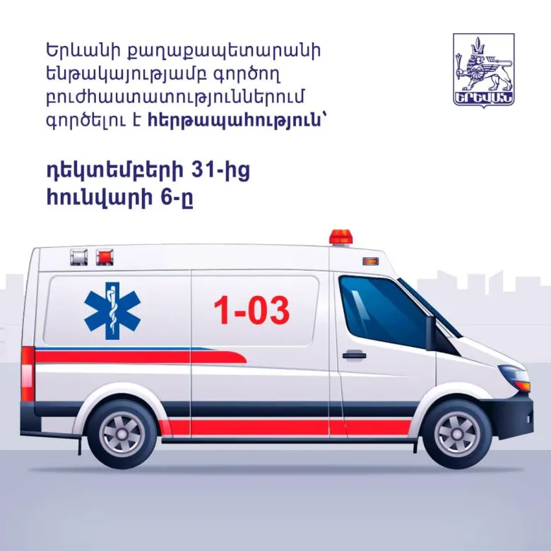 Տոնական օրերին՝ դեկտեմբերի 31-ից հունվարի 6-ը ներառյալ, Երևանի քաղաքապետարանի ենթակայությամբ գործող բուժհաստատություններում գործելու է հերթապահություն: