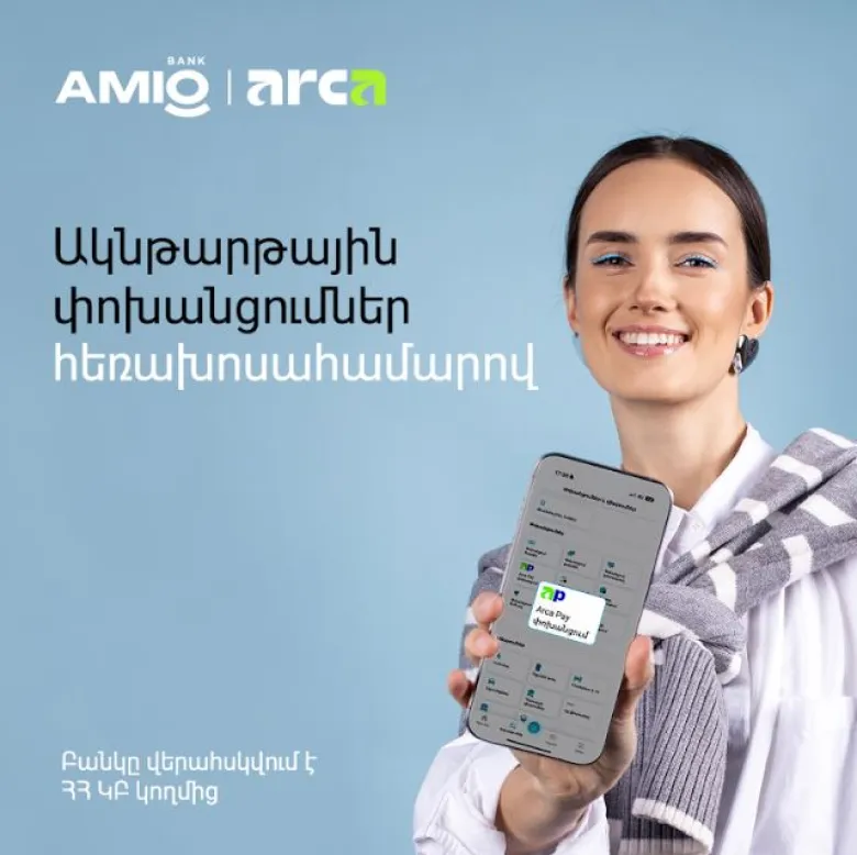 Ամիօ բանկն ուրախությամբ հայտարարում է Arca Pay փոխանցման համակարգին միանալու մասին: Այսուհետ Ամիօ բանկի ֆիզիկական անձ հաճախորդները AMIO Mobile հավելվածի միջոցով կարող են կատարել մատչելի ակնթարթային դրամային փոխանցումներ ՀՀ բանկերի հաճախորդներին` մուտքագրելով ընդամենը ստացողի բջջային հեռախոսահամարը: