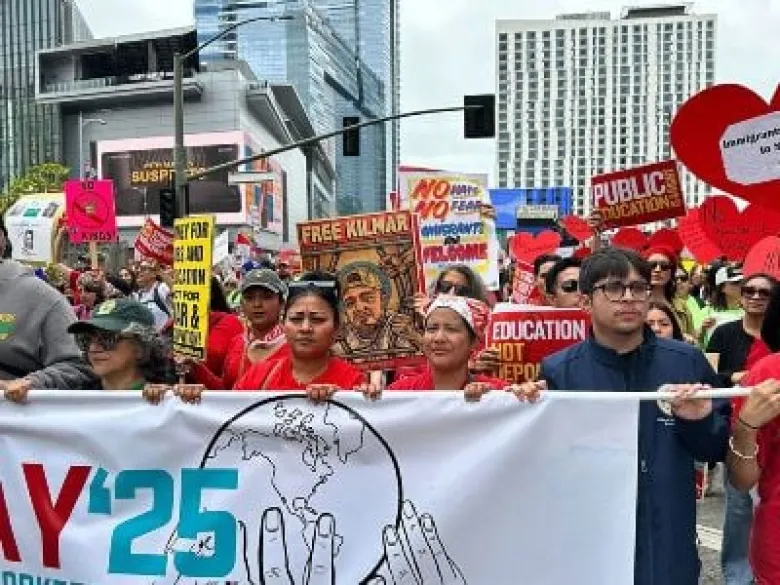 Толпы протестующих прошли сегодня маршем по центру Лос-Анджелеса, некоторые из них несли плакаты с призывом к правительству вернуть Килмара Абрего Гарсию обратно в США.