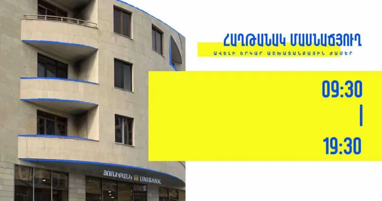 Филиал Юнибанка «Ахтанак» перешёл на новый режим работы — по удлинённому графику. Теперь клиенты могут получать полный спектр банковских услуг с понедельника по пятницу — с 9:30 до 19:30. Адрес филиала: Ереван, Комитаса 62, N94.
