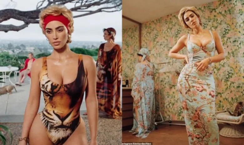 На снимках Ким практически неузнаваема — вместо привычных тёмных локонов она предстала с коротким кудрявым блонд-бобом. В одном из образов Кардашьян позирует в слитном купальнике с тигровым принтом и глубоким вырезом. Образ дополнили широкая красная повязка на голову, золотые серьги и массивный браслет.