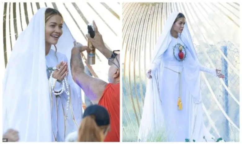 34-летняя певица Рита Ора предстала в неожиданном и дерзком образе во время съёмки в Лос-Анджелесе. Артистка облачилась в белоснежные свободные одежды и длинную фату до пола, держа в руках чётки и позируя с молитвенно сложенными руками, пишет Daily Mail.