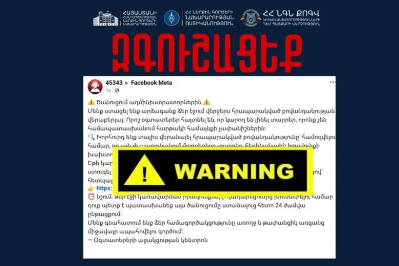 ՆԳՆ ոստիկանությունից հայտնում են․ «Եթե «Facebook» կամ «Instagram» սոցիալական ցանցերի ադմինիստրացիայի անունից ստացել եք ծանուցում ՝ Ձեր կողմից կայքի կանոնների խախտման, կամ Ձեր անհատական հաշվի վերաակտիվացման մասին, որով պահանջվում է ուղարկված հղումով տրամադրել Ձեր անհատական հաշվի մուտքանունն ու գաղտնաբառը՝ առաջացած խնդիրները լուծելու նպատակով, ՉՎՍՏԱՀԵՔ: