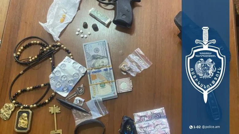 Նրա խուզարկությամբ հայտնաբերվել են ատրճանակ, փամփուշտներ, թմրամիջոցի նմանվող 4 գրամից ավելի շագանակագույն զանգված և այլն։