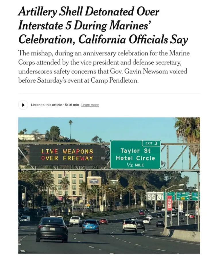 ԱՄՆ փոխնախագահ Ջ.Դ. Վենսի անվտանգության ծառայության աշխատակիցների մի մասը հարված է ստացել 155 միլիմետրանոց հրետանային արկի բեկորներից, որը վաղաժամ պայթել է Կալիֆոռնիայում ծովային հետևակի կորպուսի 250-ամյակին նվիրված ցուցադրության ժամանակ։