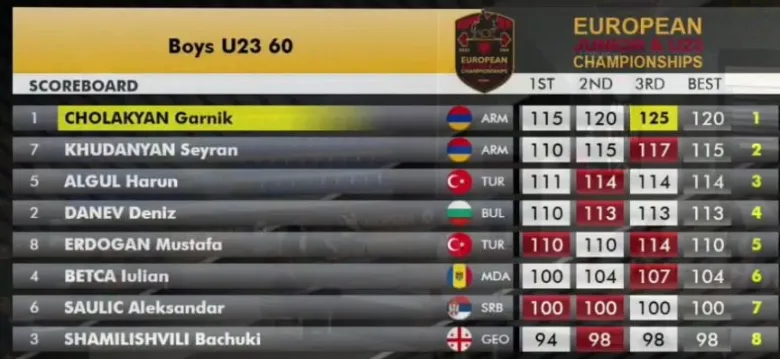 На молодежном чемпионате Европы по тяжелой атлетике, проходящем в албанском городе Дуррес, армянские спортсмены завоевали две малые медали в упражнении «рывок» в весовой категории до 60 кг.