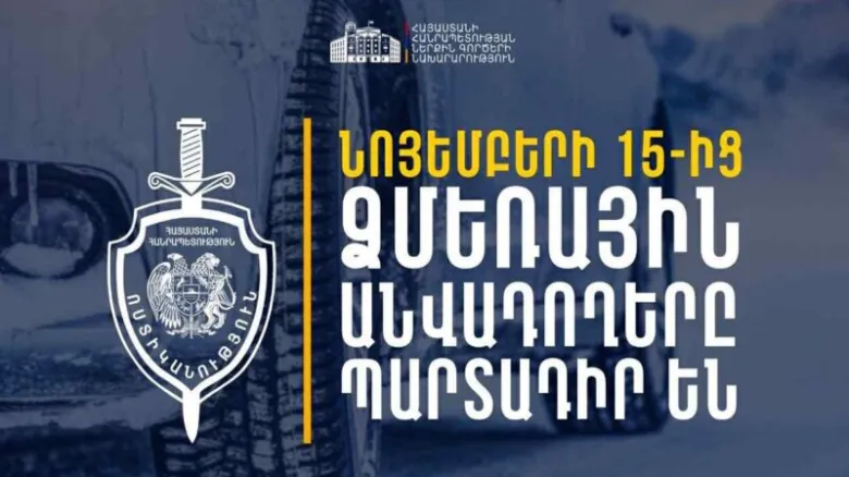 նոյեմբերի 15-ից մարտի 31-ը ներառյալ առանց համապատասխան ձմեռային անվադողերի տրանսպորտային միջոցների շահագործումը կարգելվի։ Այս մասին տեղեկանում ենք ՆԳՆ-ից։