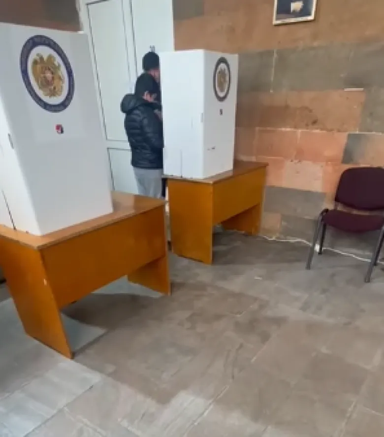 14/12 տեղամասում ընտրողը նկարահանում է ծրարը: Քվեախցիկում երեխայի հետ է