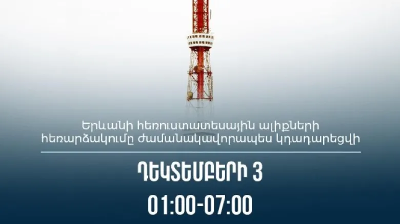 Դեկտեմբերի 3-ին՝ ժամը 01։00-07։00-ն ընկած ժամանակահատվածում, Երևանի հեռուստատեսային ալիքների հեռարձակումը ժամանակավորապես կդադարեցվի։