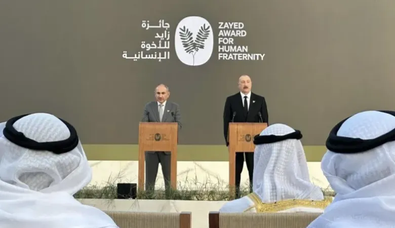 Տեղեկանք. Zayed Award for Human Fraternity մրցանակը Իլհամ Ալիևին և Նիկոլ Փաշինյանին հանձնվել է փետրվարի 4-ին Աբու Դաբիում (ԱՄԷ)՝ «Հայաստանի և Ադրբեջանի միջև հարաբերությունների կարգավորման և երկխոսության առաջմղման ուղղությամբ գործադրած ջանքերի համար»։ Արարողությունը տեղի է ունեցել երկու առաջնորդների՝ Արաբական Միացյալ Էմիրություններ կատարած այցի շրջանակում։