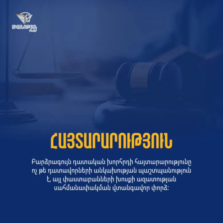 Փաստաբանի գործունեության վերաբերյալ Բարձրագույն դատական խորհրդի հայտարարությունը ոչ թե դատավորների անկախության պաշտպանություն է, այլ փաստաբանների խոսքի ազատության սահմանափակման վտանգավոր փորձ։ Այս մասին հայտարարություն է տարածել «Միասնության թևեր» նախաձեռնությունը։