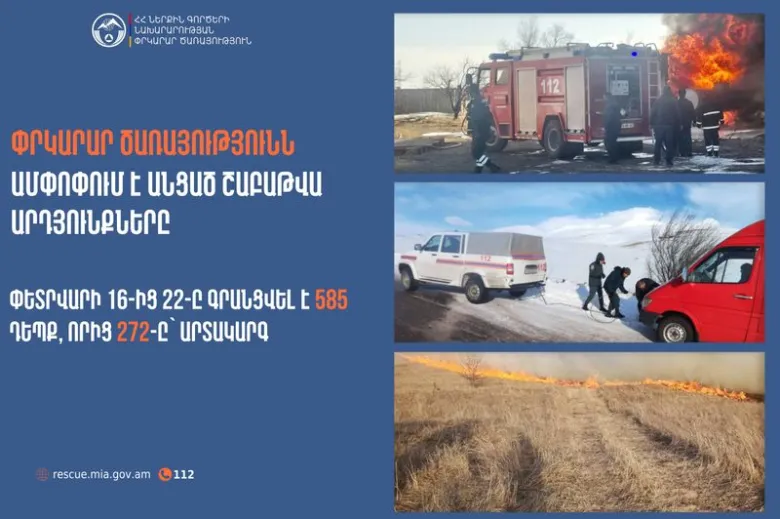 Փետրվարի 16-ից 22-ը ՆԳՆ ՓԾ ճգնաժամային կառավարման ազգային կենտրոնում գրանցվել է 585 դեպք, որից 272-ը՝ արտակարգ: