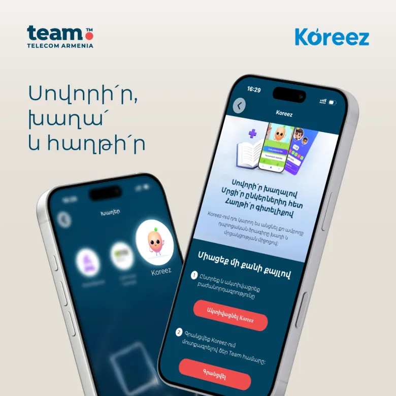 17-ը ապրիլի, 2026 թ․, Երևան. Սովորի՛ր, խաղա՛ և հաղթի՛ր. Team Telecom Armenia-ն և Koreez համահայկական կրթական ծրագիրը նախաձեռնել են նոր համագործակցություն՝ միավորելով ուժերը դպրոցականների կրթության զարգացման նպատակով: Team Telecom Armenia-ի բաժանորդները այսուհետ կարող են հեշտությամբ օգտվել Koreez կրթական հավելվածից՝ անմիջապես My Team հավելվածի միջոցով: