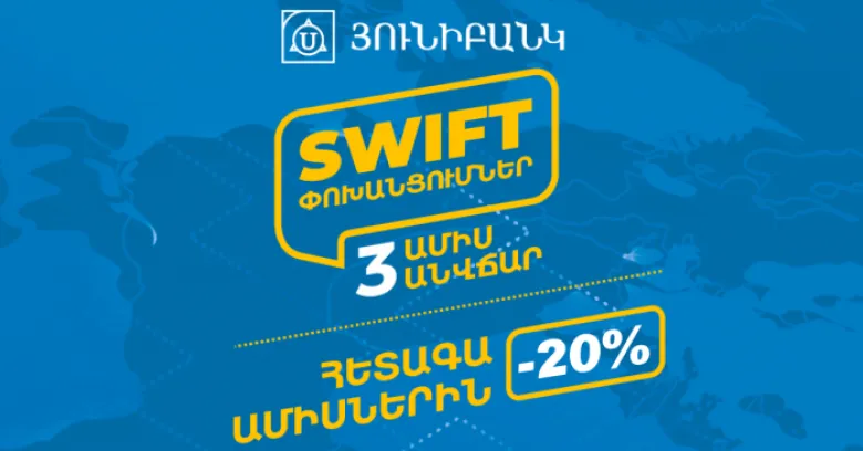 - առաջին երեք ամսվա ընթացքում SWIFT փոխանցումների իրականացում անվճար, այնուհետև՝ 9 ամսվա ընթացքում՝ 20% ցածր սակագնով,