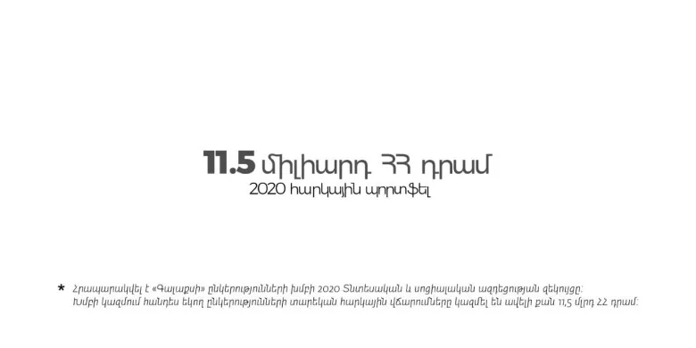 Որպես պատասխանատու բիզնես՝ «Գալաքսի» ընկերությունների խումբը 2020 թվականին Հայաստանի Հանրապետության բյուջեին հարկային վճարումների տեսքով փոխանցել է ավելի քան 11,5 միլիարդ ՀՀ դրամ (ավելի քան 22 միլիոն ԱՄՆ դոլար):