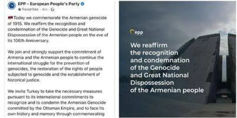 Եվրոպական ժողովրդական կուսակցությունը իր պաշտոնական ֆեյսբուքյան էջում անդրադարձել է Հայոց ցեղասպանության 106-րդ տարելոցին։