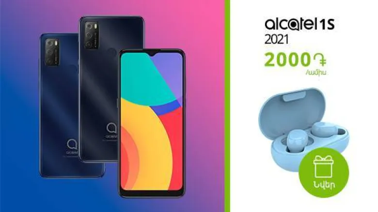 Ucom ընկերությունն առաջարկում է ձեռք բերել 2021թվականի արտադրության Alcatel 1S սմարթֆոնն ամսական ընդամենը 2000 դրամով և ստանալ նվեր` TWS Hiper Oki վարդագույն և կապույտ անլար ականջակալներից մեկը: