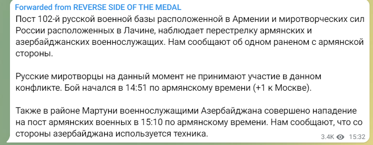 Հայաստանում տեղակայված ռուսական 102-րդ ռազմաբազայի և Լաչինում տեղակայված Ռուսաստանի խաղաղապահ ուժերը հետևում են հայ և ադրբեջանցի զինծառայողների փոխհրաձգությանը ։ Այս մասին հայտնում է Baghramyan 26 թելեգրամ ալիքը։ Ըստ տեղեկության ՝ հայկական կողմից մեկ վիրավորի կա։
