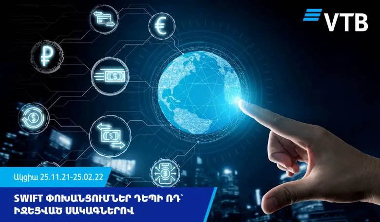 ՎՏԲ-Հայաստան Բանկն առաջարկում է ֆիզիկական անձանց 25.11.21-25.02.22թթ․ կատարել դրամական փոխանցումներ դեպի Ռուսաստան ՌԴ ռուբլով, ԱՄՆ դոլարով և Եվրոյով՝ իջեցված սակագներով: