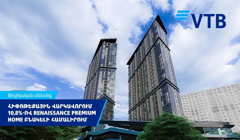 ՎՏԲ-Հայաստան Բանկը և «ԵՊՀ շրջանավարտների միավորում» կառուցապատող ընկերությունը մեկնարկել են համատեղ հիփոթեքային ծրագիր Renaissance Premium Home բազմաֆունկցիոնալ բնակելի համալիրում բնակարանների գնորդների համար՝ տարեկան 10,8% տոկոսադրույքով: