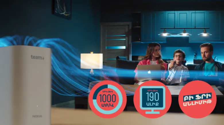 Բաժանորդագրվելով Team-ի COSMO և COMBO փաթեթներին՝ հաճախորդի տանը, ըստ անհրաժեշտության տեղադրվելու էNokia GPON և NokiaBeaconWiFi ուժեղացուցիչ անլար ինտերնետի անգերազանցելի որակ ապահովելու համար։