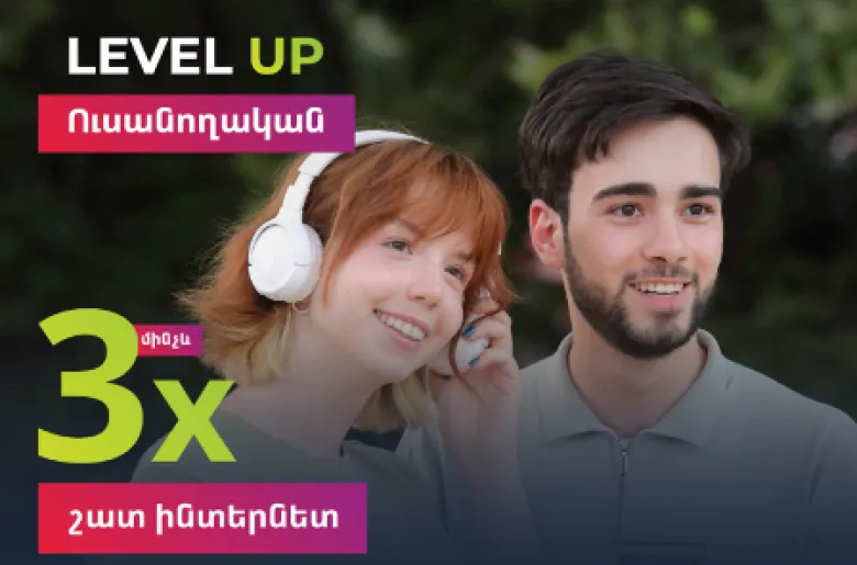 До 31 декабря сего года любой студент, являющийся новым или текущим абонентом компании Ucom, может подключиться к постоплатному тарифному плану Level Up 3000 и в течение 24 месяцев получать в 3 раза больше высокоскоростного интернета, то есть 30 ГБ вместо обычных 10 ГБ. А при подключении к предоплатному тарифному плану Level Up 1700 студенты получат в 2 раза больше высокоскоростного мобильного интернета, а именно: 12 ГБ вместо 6 ГБ.