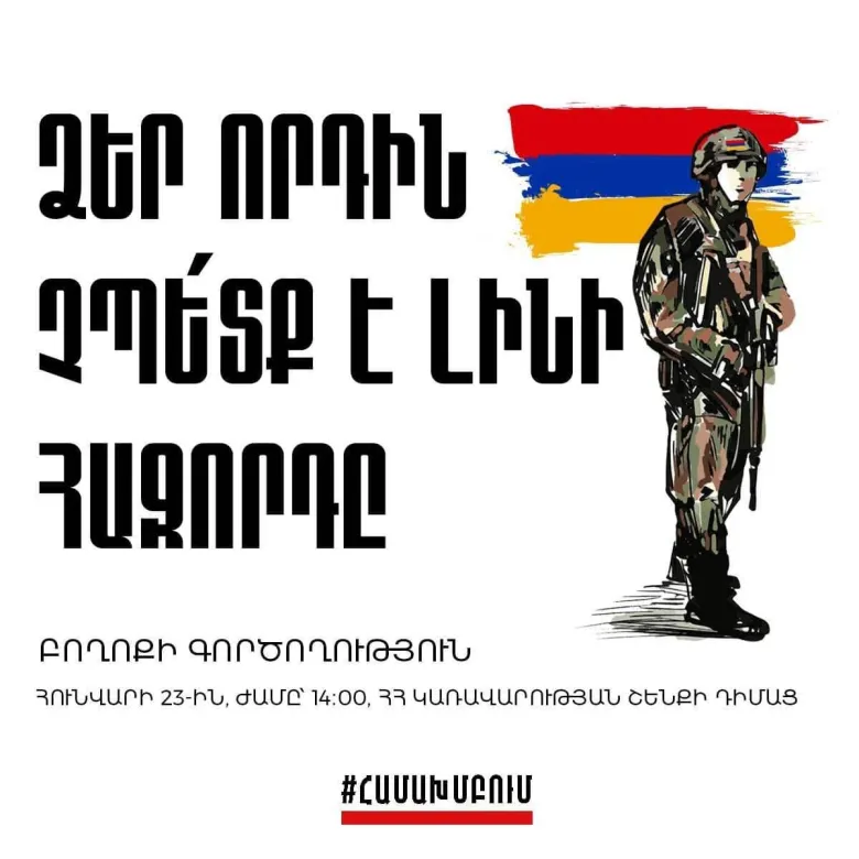 Անսալով ձեր պահանջին, այսօր, Հունվարի 23-ին, ժամը` 14:00-ին մեր «Համախմբում» շարժումը ՀՀ կառավարության շենքի դիմաց անց է կացնելու բողոքի գործողություն։