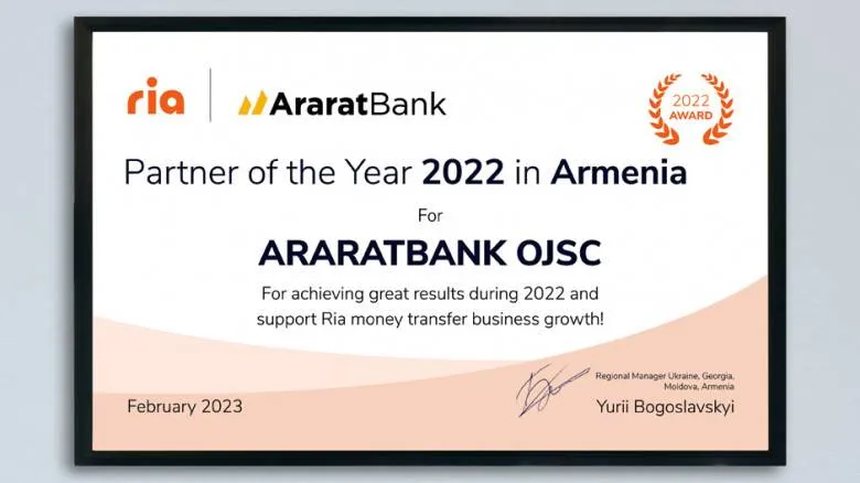 Ria Money Transfer համակարգն ԱրարատԲանկին հերթական անգամ արժանացրել է 2022թ․ «Տարվա գործընկեր» մրցանակին։