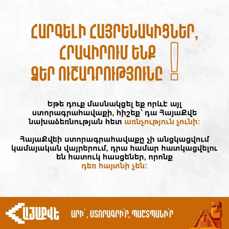 - եթե դուք մասնակցել եք որևէ այլ ստորագրահավաքի, հիշե՛ք՝ այն ՀայաՔվե նախաձեռնության հետ առնչություն չունի;