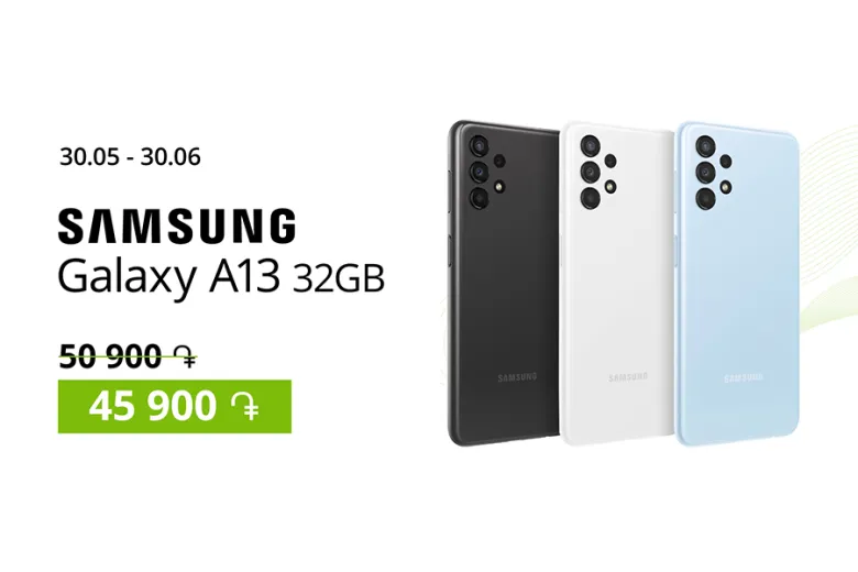До 30 июня в центрах обслуживания абонентов Ucom, а также в онлайн-магазине Ucom можно приобрести смартфон Samsung Galaxy A13 со встроенной памятью в 32 ГБ всего за 45900 драмов вместо прежних 50900. Смартфон доступен в голубом и черном оттенках.